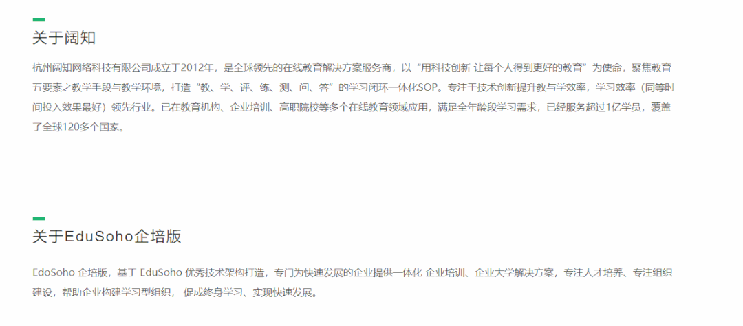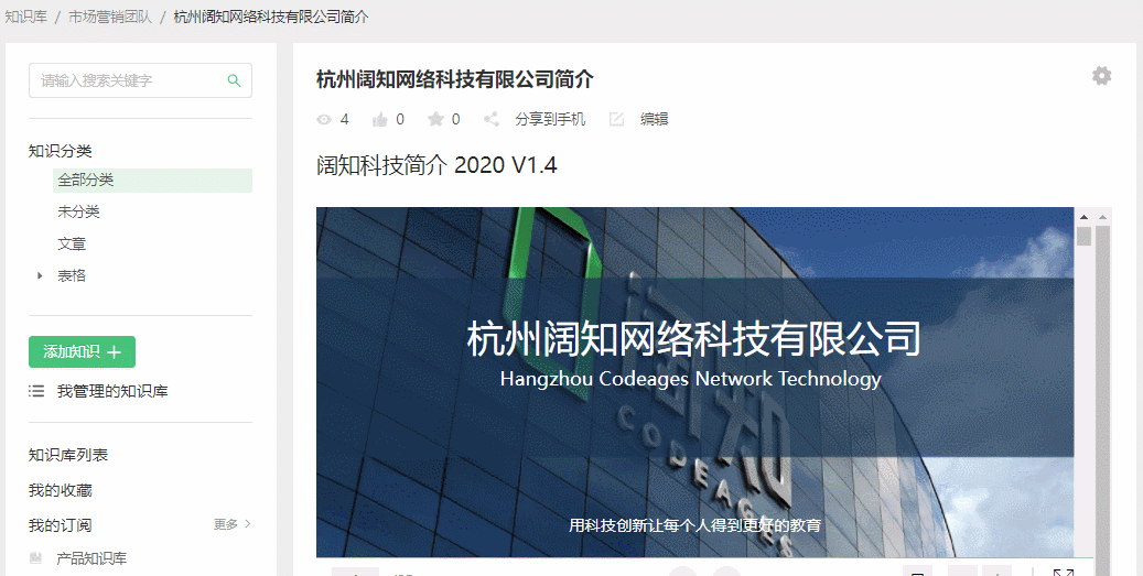 ►产品:EduSoho企培版知识库,不同于传统的文档式知识库,而是将所有知识都基于“知识页”的方式分别独立呈现。