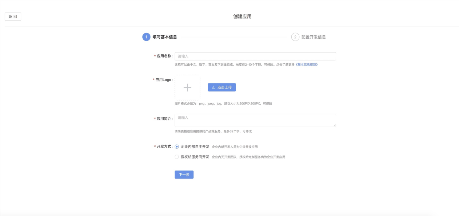 第二步:填写应用基本信息。包括应用名称、应用Logo和应用简介,选择"企业内部自主开发",点击"下一步"。