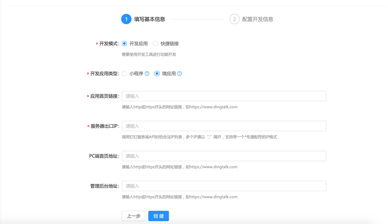 第三步:开发模式选择“开发应用”,开发应用类型选择“微应用”,【应用首页链接】和【PC端首页地址】填写EduSoho企培版平台首页url,服务器出口IP填写企培平台站点IP,设置完成后点击创建完成H5微应用创建。
