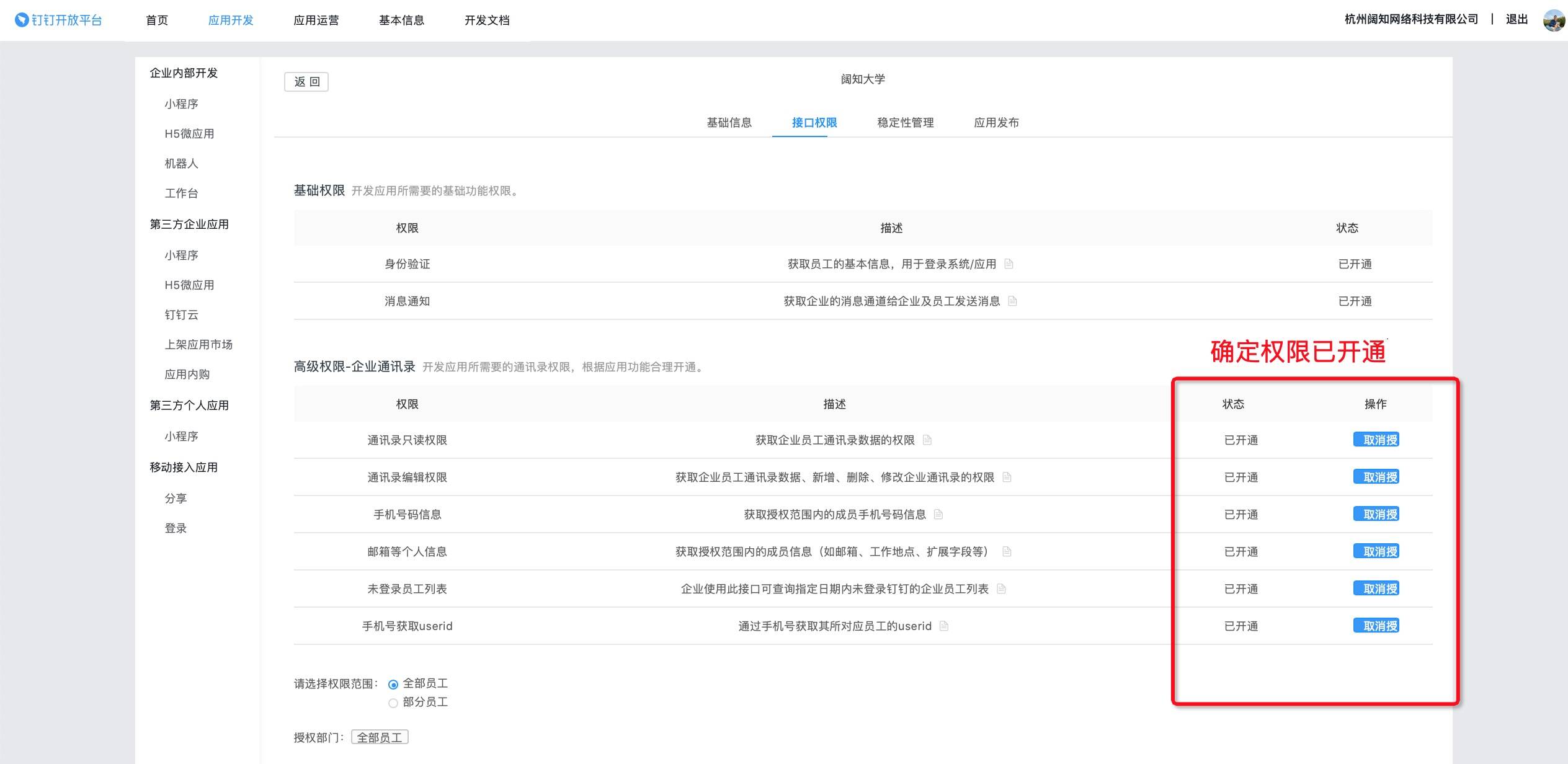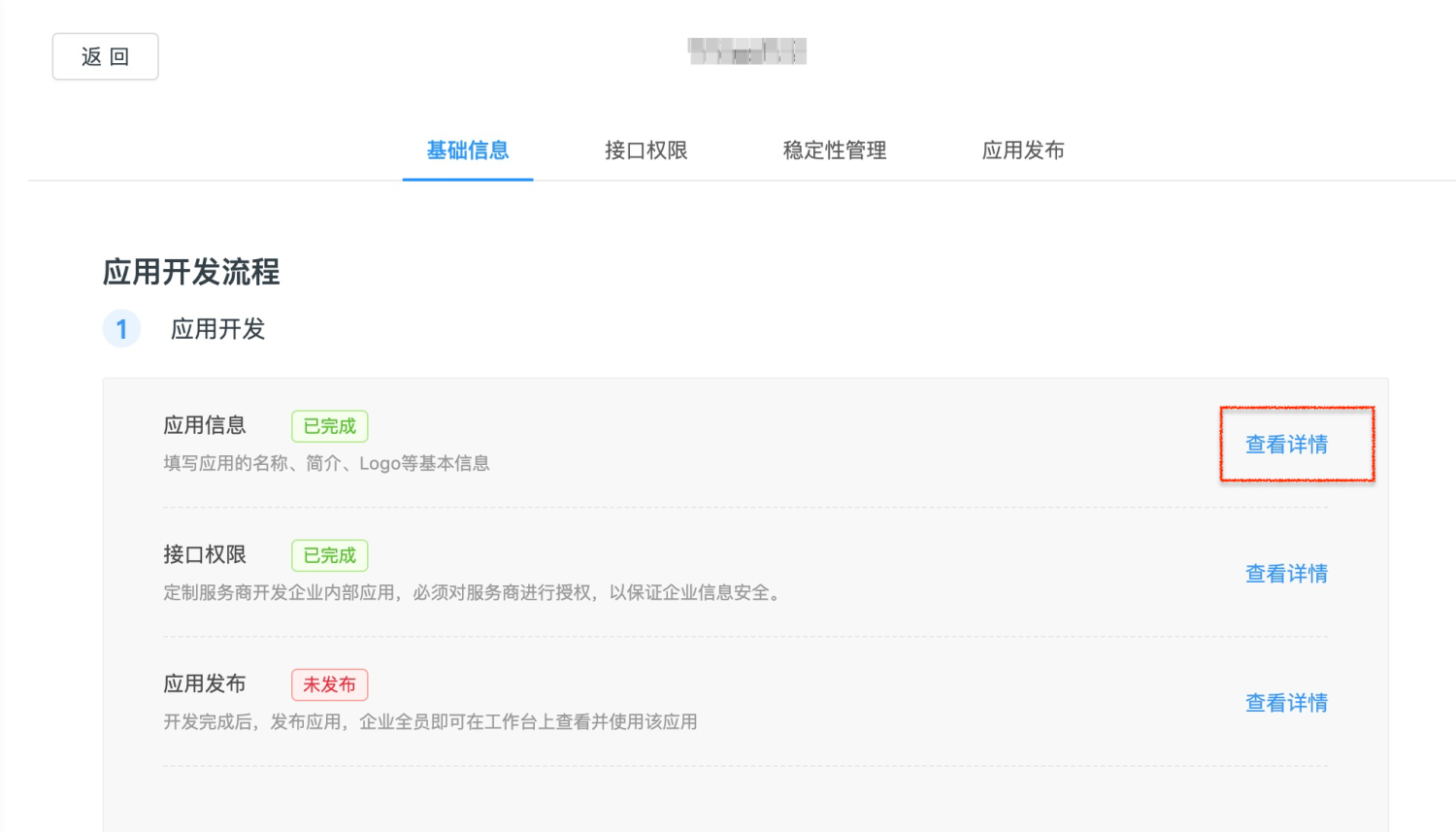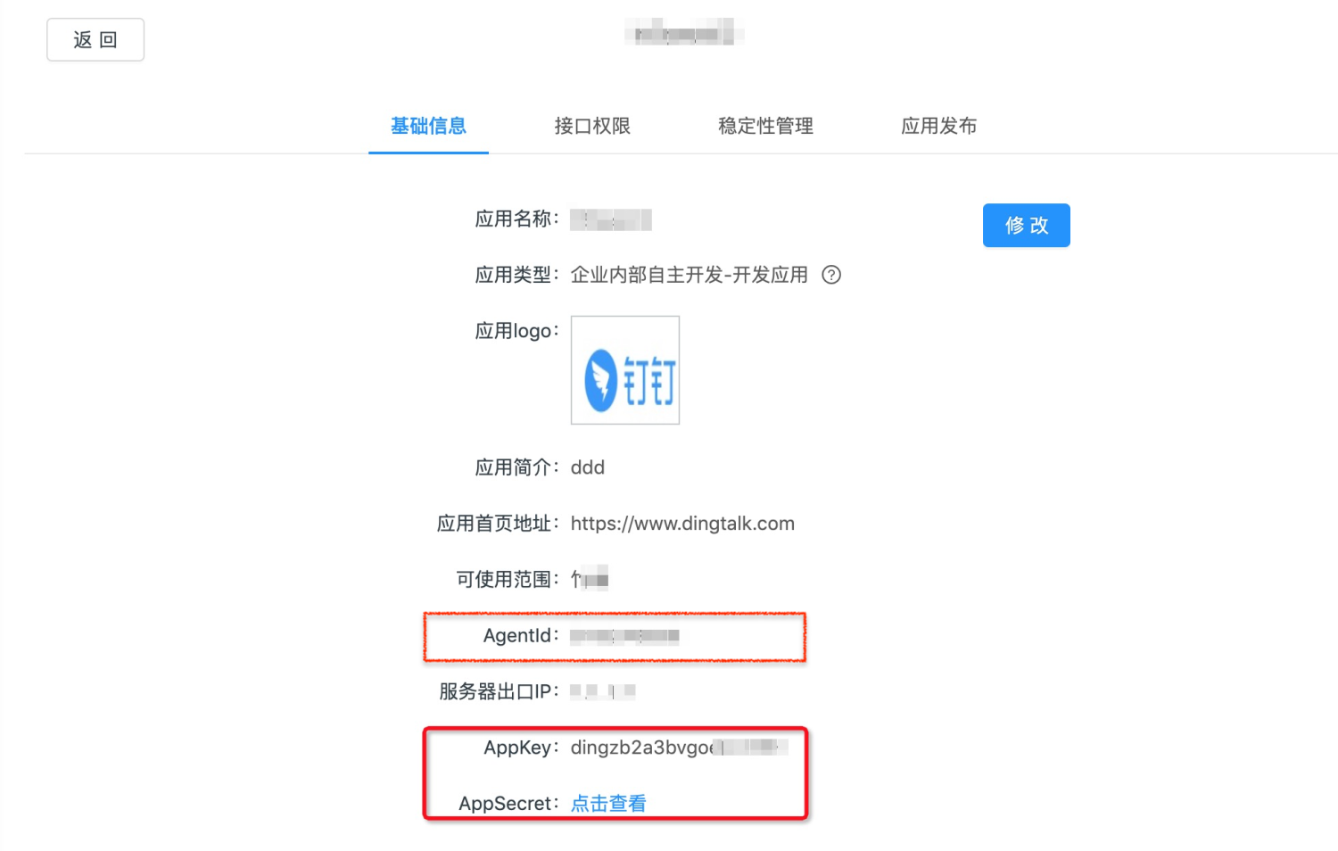 第四步:填写完成后,点击“创建”,即可成功创建微应用。点击查看详情,可以查看生成的【agentId】【appKey】和【appSecret】。并开通接口权限。