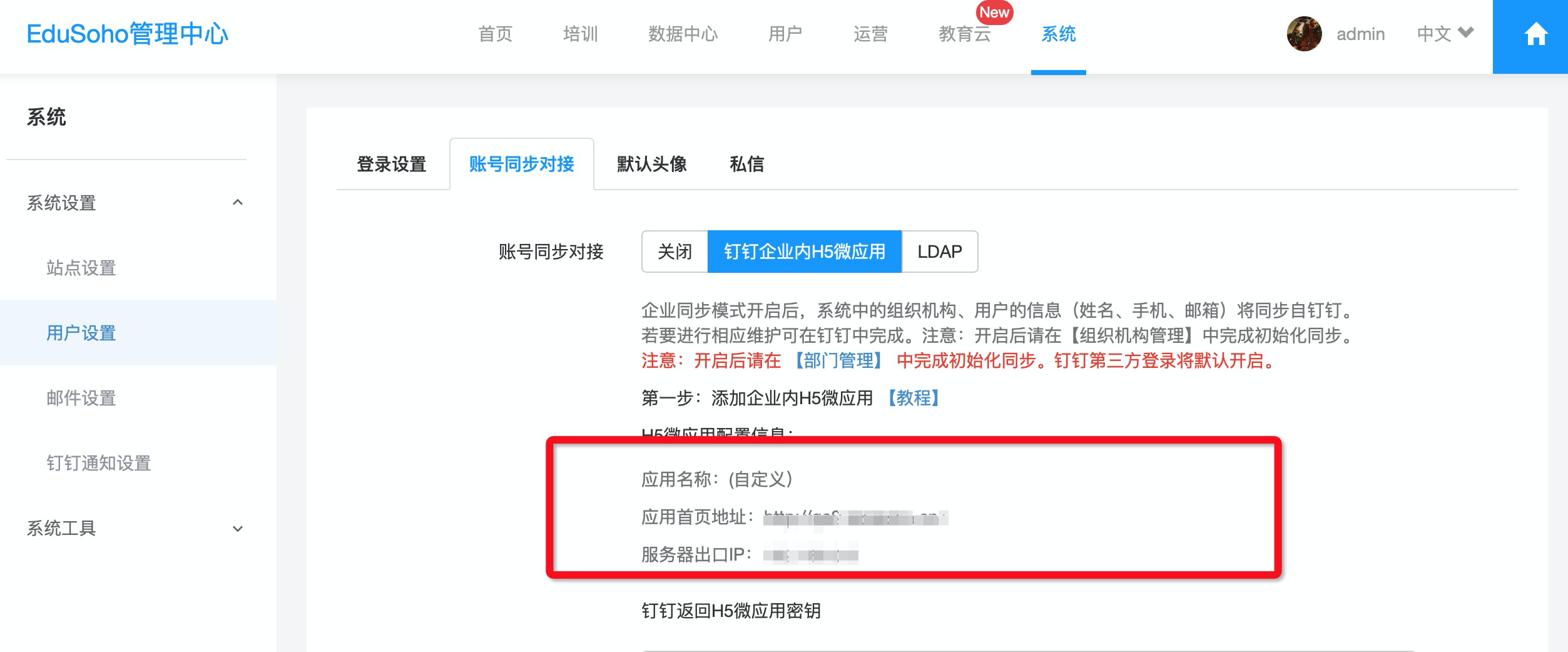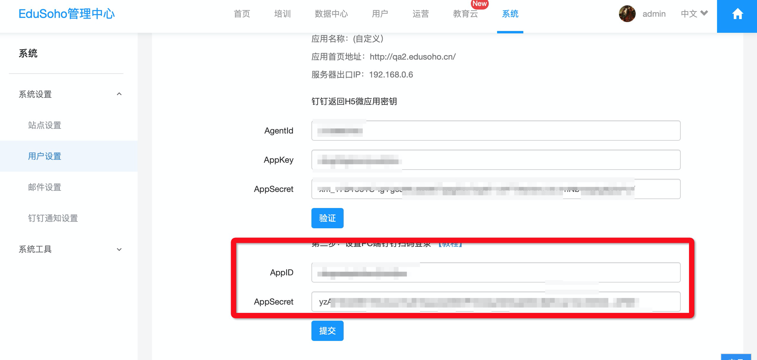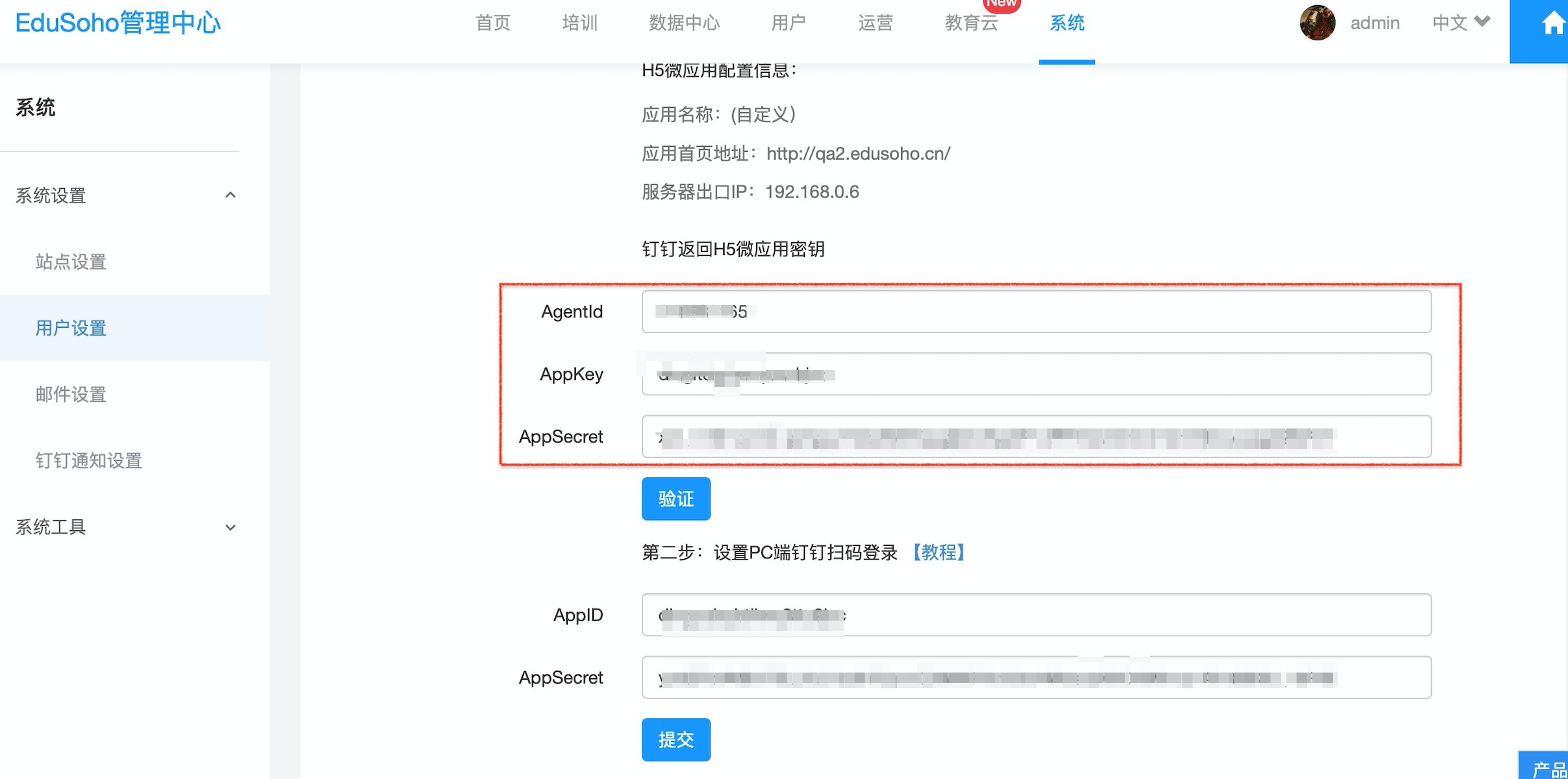 第五步:将获取的【agentId】【appKey】和【appSecret】填写到EduSoho【系统】-【用户设置】-【钉钉企业内H5微应用】中。