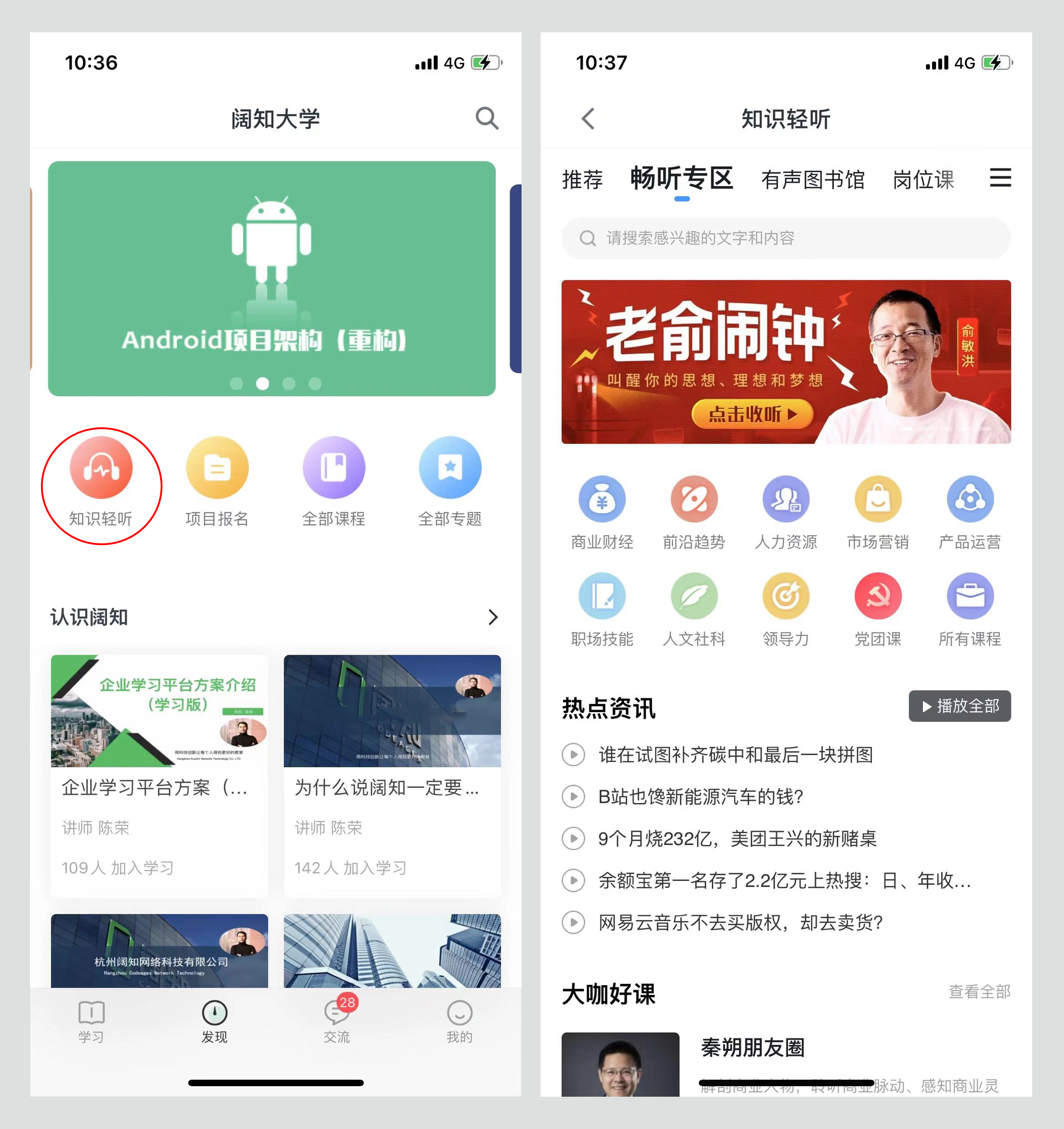 【知识轻听】栏目包含领导力、职业能力、前沿科技等各类职场课程,EduSoho企培用户打开【ES企培】App,点击【知识轻听】即可免费畅听。