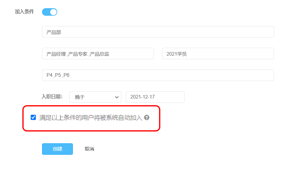 [开启自动加入路径] 培训——培训项目——创建项目——设置加入条件——勾选“满足以上条件用户将被系统自动加入”