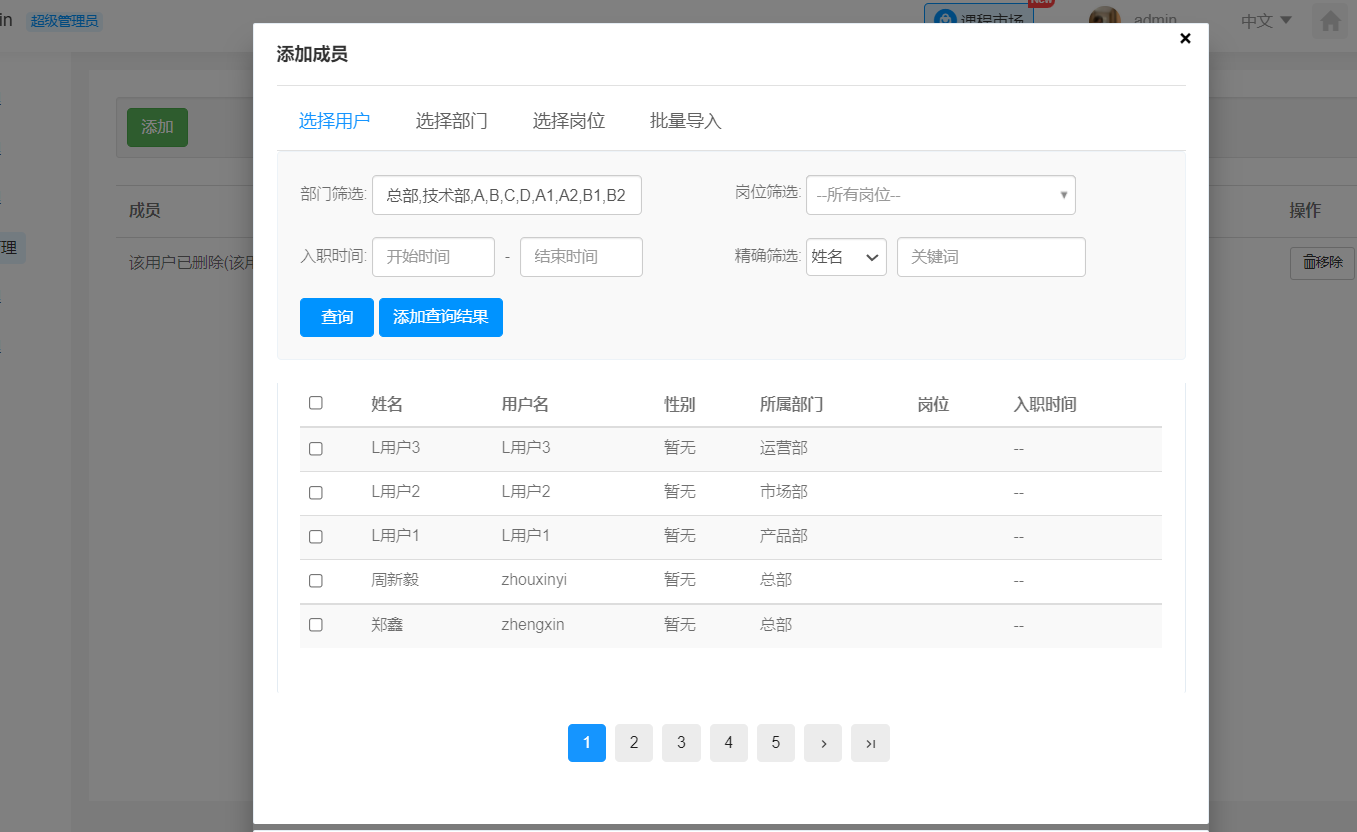 用户组功能更新,用户组可通过“部门”、“岗位”、“入职时间”、“精准查找”等多种方式筛选方式添加新用户。