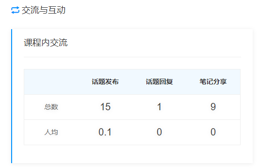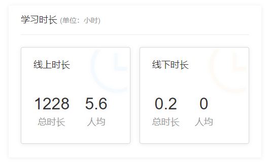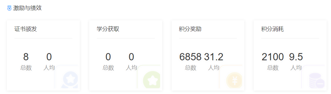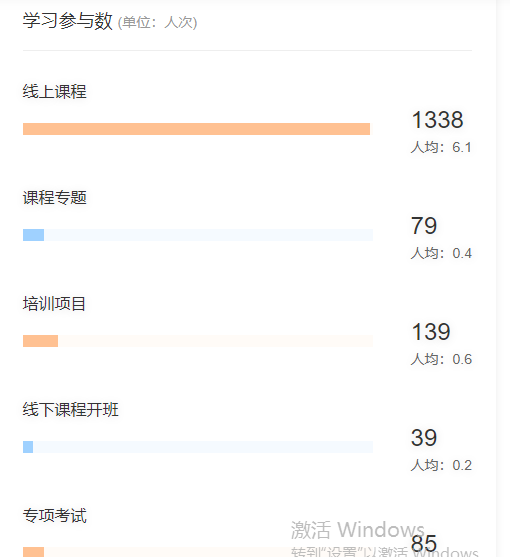 展示符合搜索条件的全部未封禁用户的线上课程、课程专题、线下课程、培训项目、专项考试、线下活动6大类学习过的课程总数、人均学习课程数