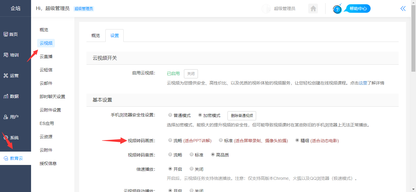 3、确认转码时候选择的清晰度、转码类型,一般情况默认是【教育云】-【云视频】-【云视频设置】的转码画质,在上传的地方也可单独设置。