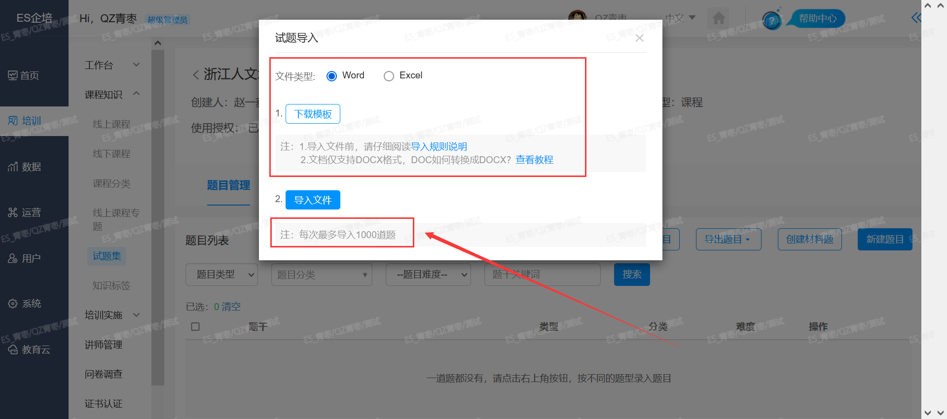 第四步:题目管理可以手动点击新建题目,可以导入导出题目;点击导入的话严格按照下载模板格式来上传,支持Word 、Excle,格式详情见模板。