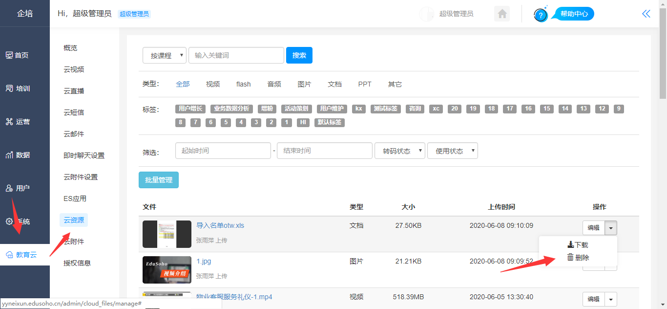 2、如果要删除当前登录的账号或其他账号上传的资料