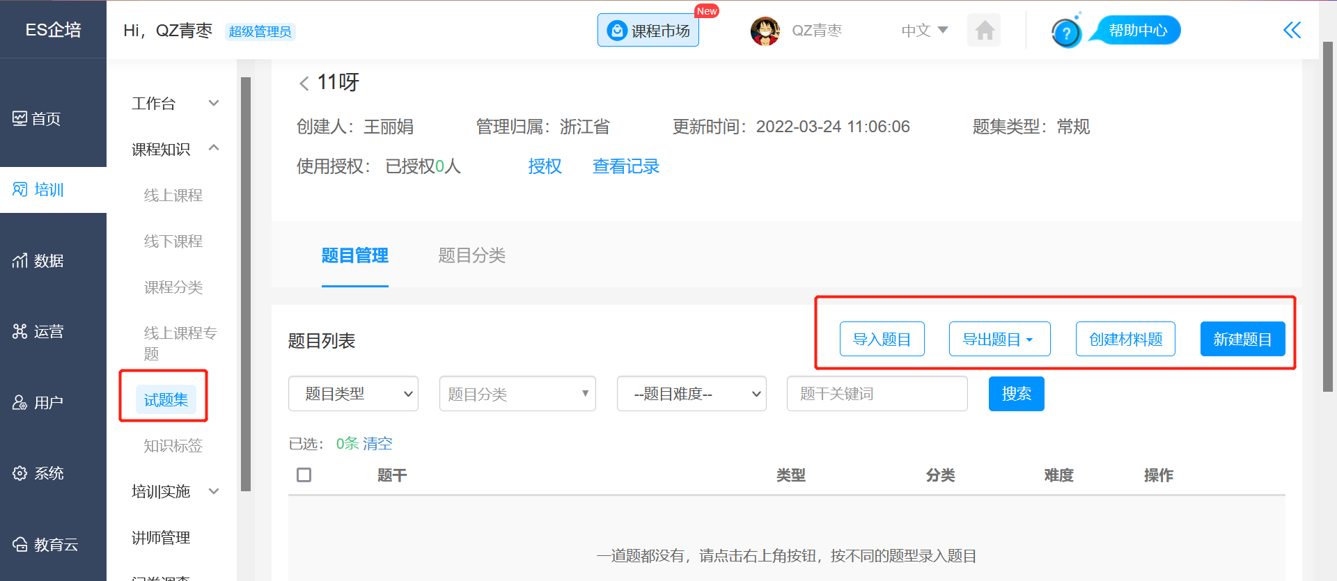 管理后台--培训--课程知识--试题集;如图所示,点击创建试题集按钮创建,填写试题集名称,设置管理归属。