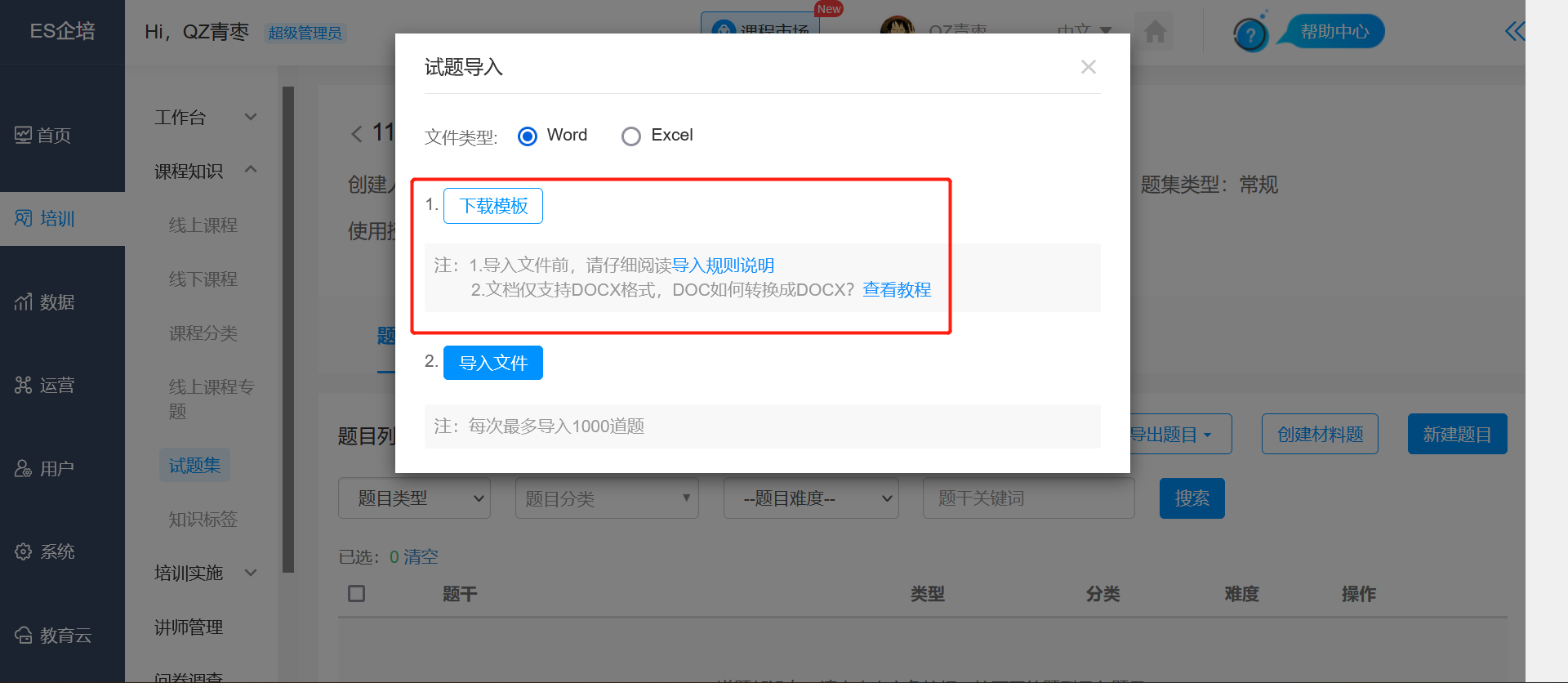 批量导入题目有文档和表格2种模板,如图所示,文件里面有导入规则说明。
