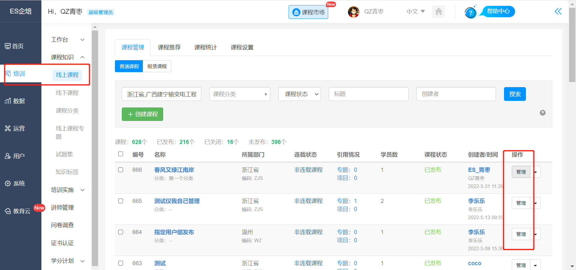 1、在【管理后台】-【培训】-【课程知识】-【线上课程】页面,选中对应课程点击管理打开课程管理页面;如图所示,