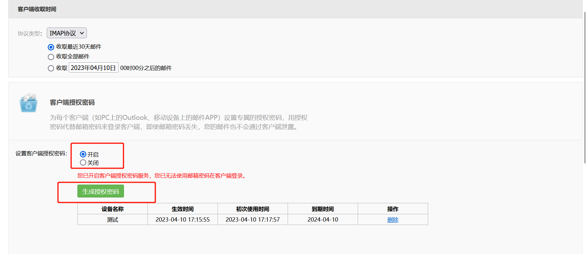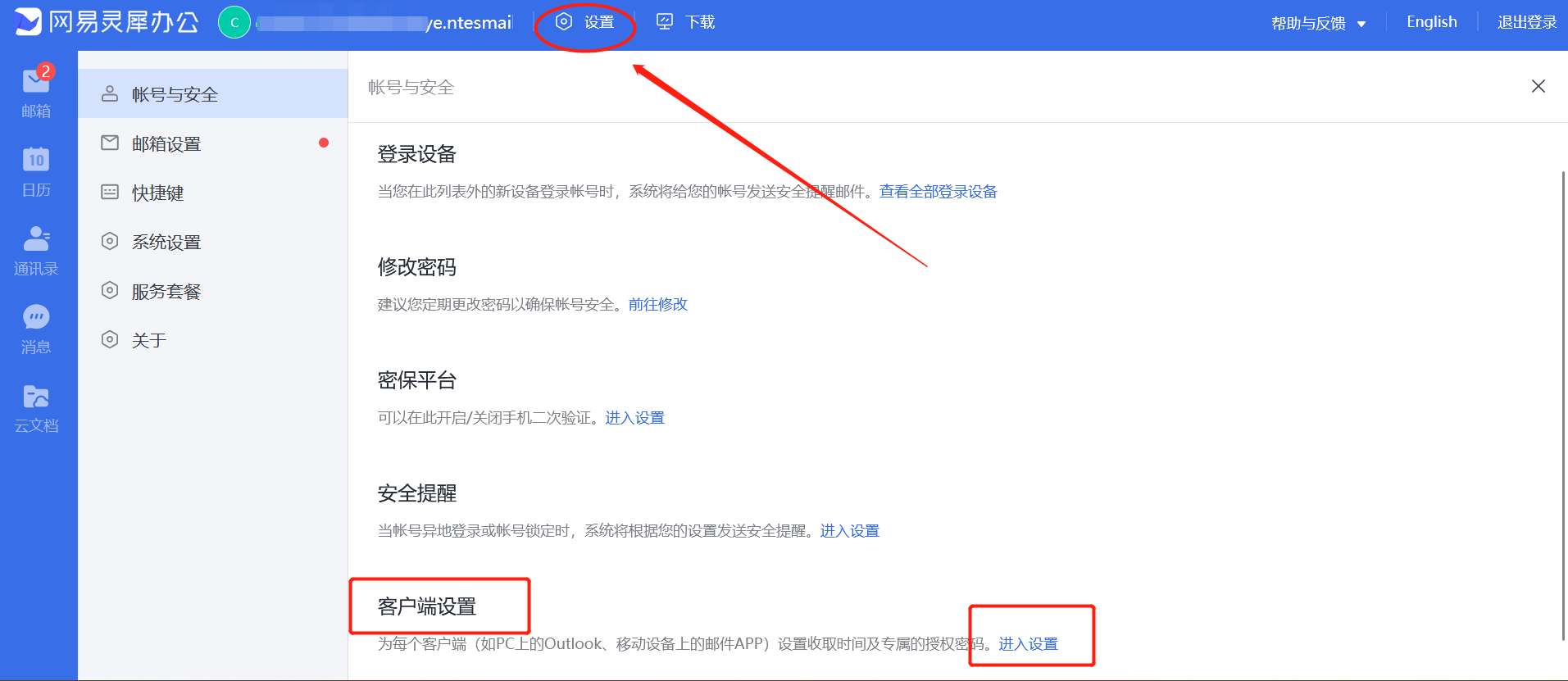 1、先登录网易企业邮箱后台普通账户或管理员账户,如图所示,点击设置--帐号与安全--客户端设置,进入设置开启设置客户端授权密码,后点击生成授权密码。
