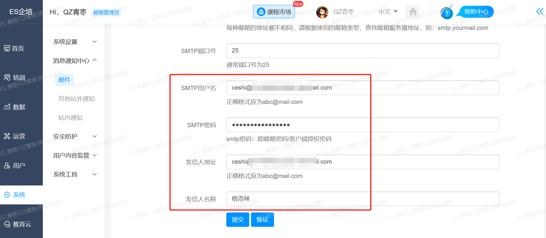 2、【管理后台】--【系统】--【消息通知中心】--【邮件服务设置】开启邮件发送,如图所示,填写邮箱的授权信息,网易邮箱SMTP服务器地址是smtphz.qiye.163.com 端口号默认是25 。