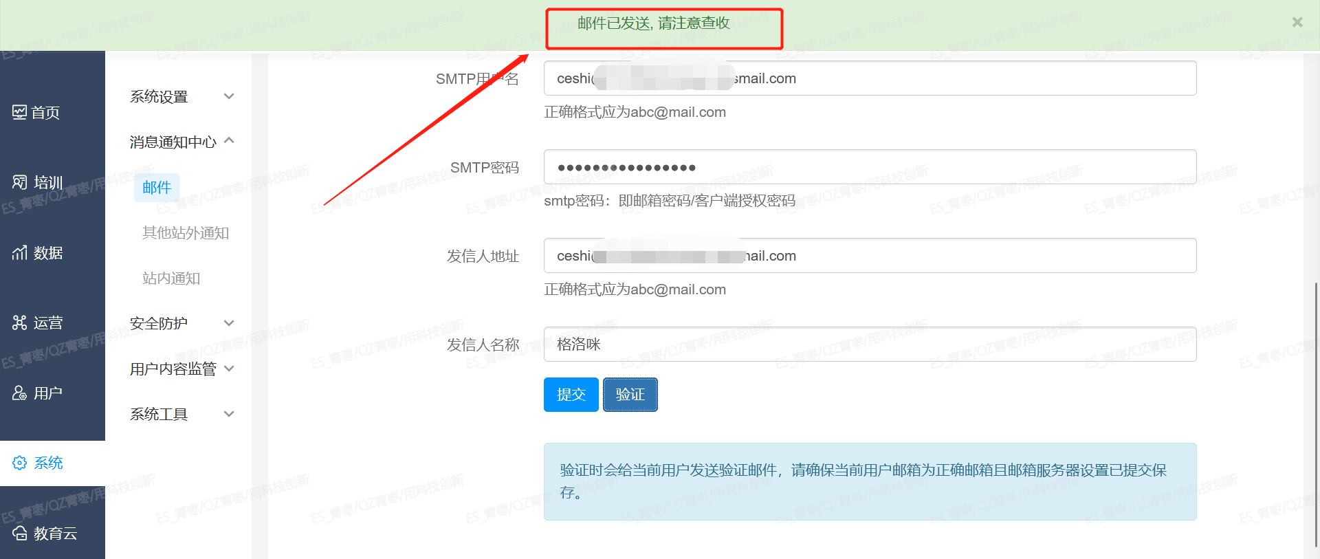 路径1:点击当前页面底部的【验证】,如果可以看到页面顶部的提示:验证邮件已发送,请注意查收,则说明邮箱配置是成功的。