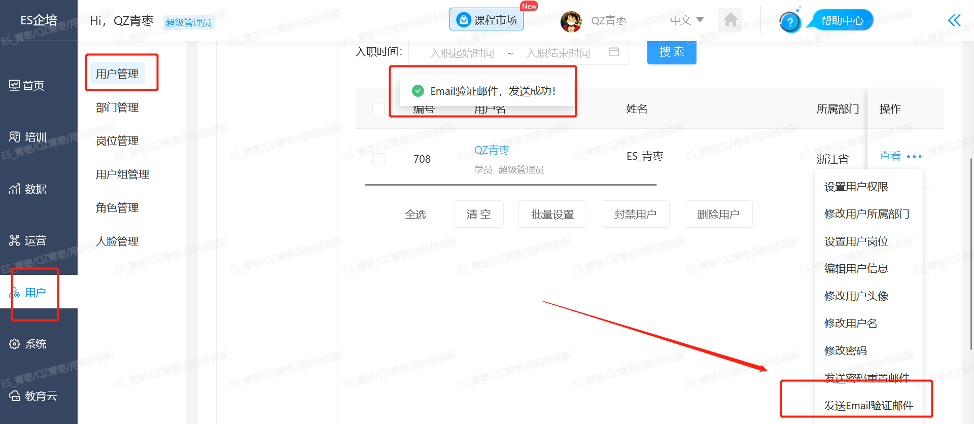 路径2:【管理后台】-【用户】-【用户管理】-【操作】-【发送email验证邮件】,若页面弹出提示:Email验证邮件,发送成功! 邮箱配置就是成功的。
