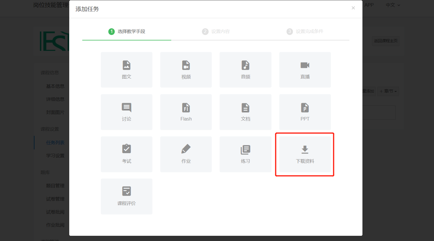 路径:【课程管理页】-【任务列表】-【添加任务】中选择【下载资料】任务类型,上传资料成功后,会自动同步显示在这门课程的资料区中,学员加入课程,即可下载资料;