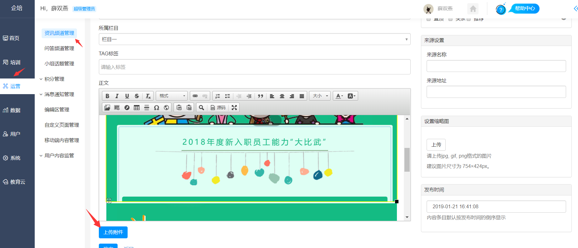 说明:如果没有“上传附件”的按钮,请先到【教育云】-【云附件设置】中开启附件并勾选“资讯”。