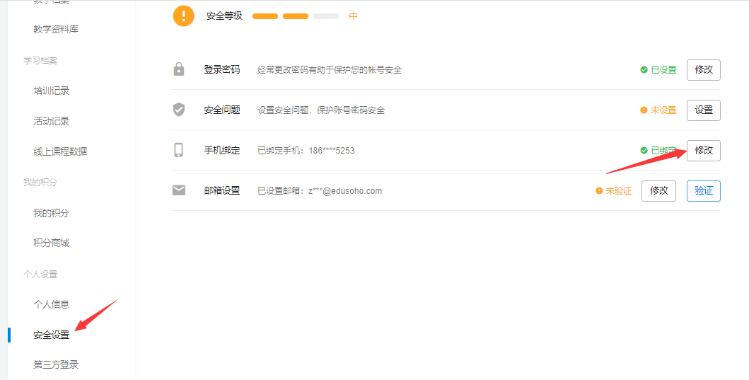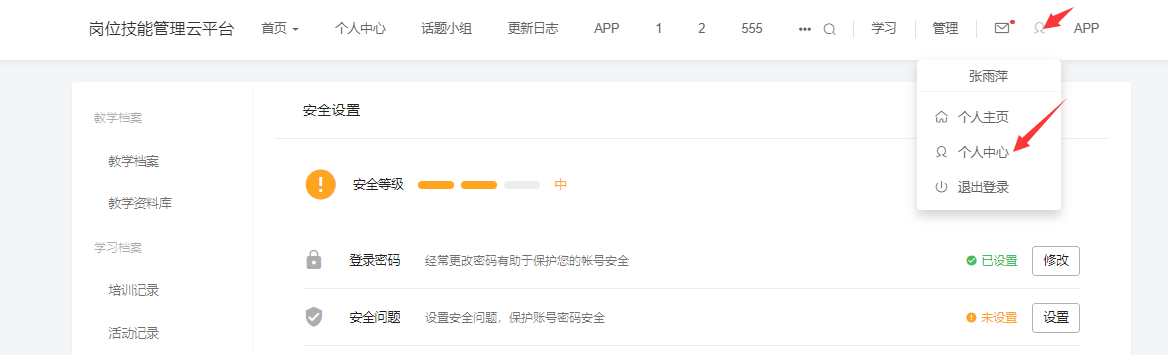 2.进入个人中心,个人设置-安全设置,登录密码,点击修改,输入原密码和新密码进行修改