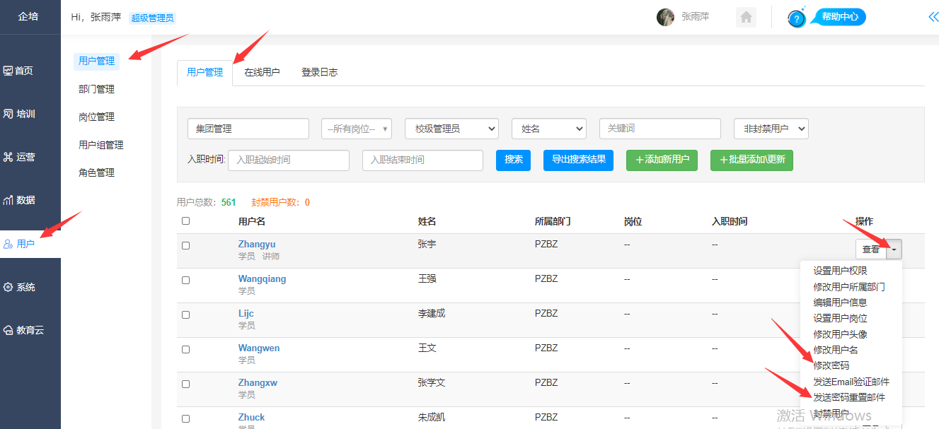 3.超级管理员在管理后台==用户==用户管理,输入对应的用户名,进行修改