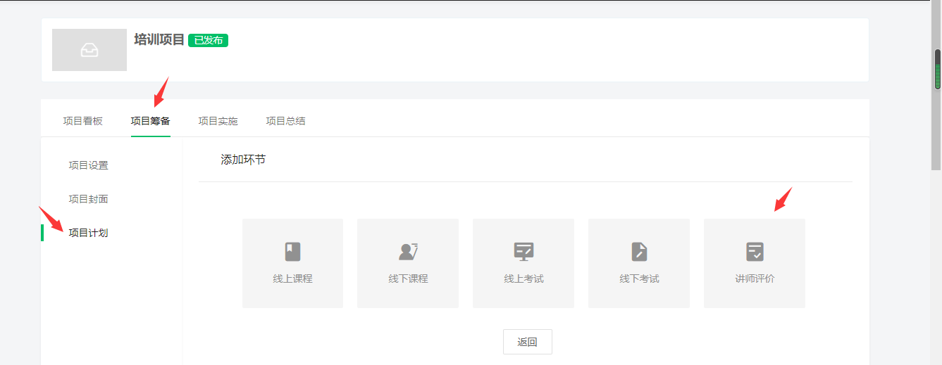 路径:【培训项目】-【项目筹备】-【项目计划】-【添加内容】-【讲师评价】,选择已经添加的线下课程,根据选择的课程来对讲师进行评价.