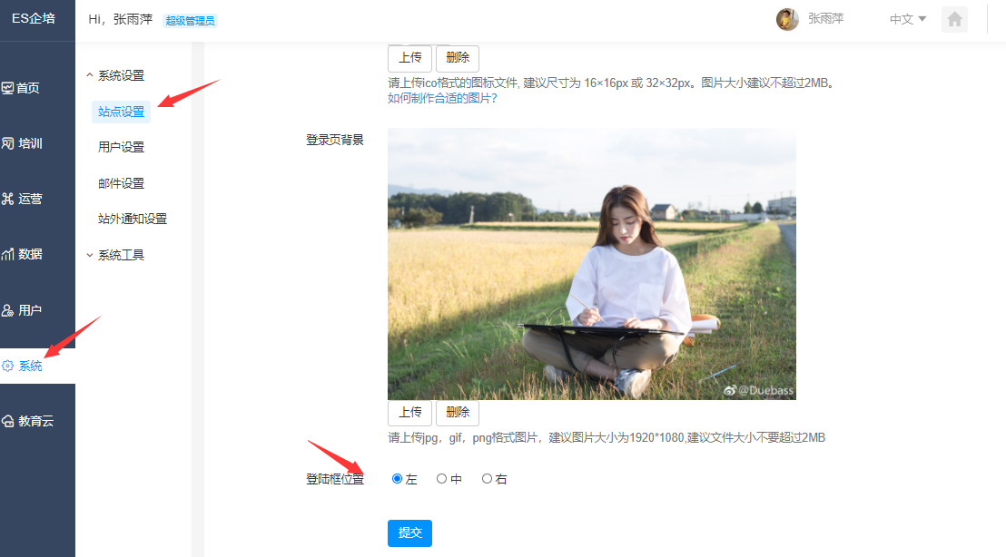 路径:【管理后台】-【系统】-【站点设置】-【LOGO和图标】,登录框面板位置,可选择左 中 右。