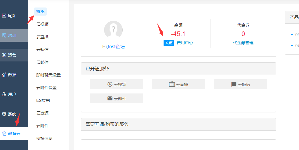 在【管理后台】-【教育云】-【概览】-【充值】点进去输入金额,可以使用支付宝支付 或登录ES教育云充值:open.edusoho.com