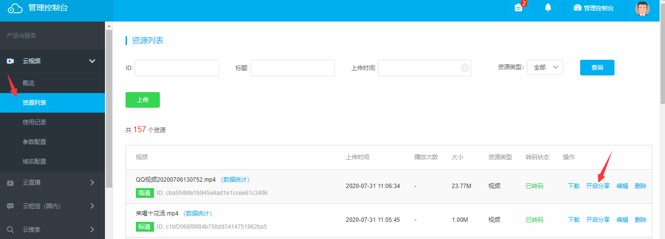 进入教育云平台-云视频-资源列表-开启分享,将分享链接分享至其他播放平台。