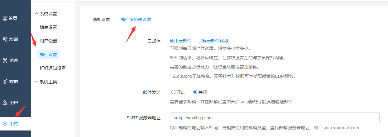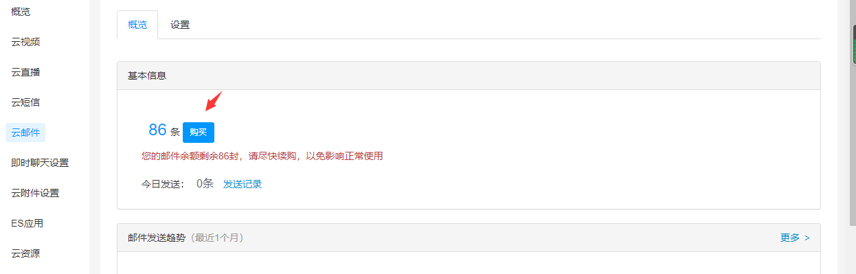 在【管理后台】-【教育云】-【云邮件】,开启云邮件功能,需要购买云邮件发送的条数。