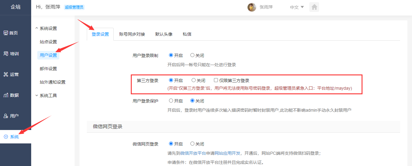 路径:【管理后台】-【系统】-【用户设置】-【登录设置】,可以选择开启/关闭/仅第三方登录。