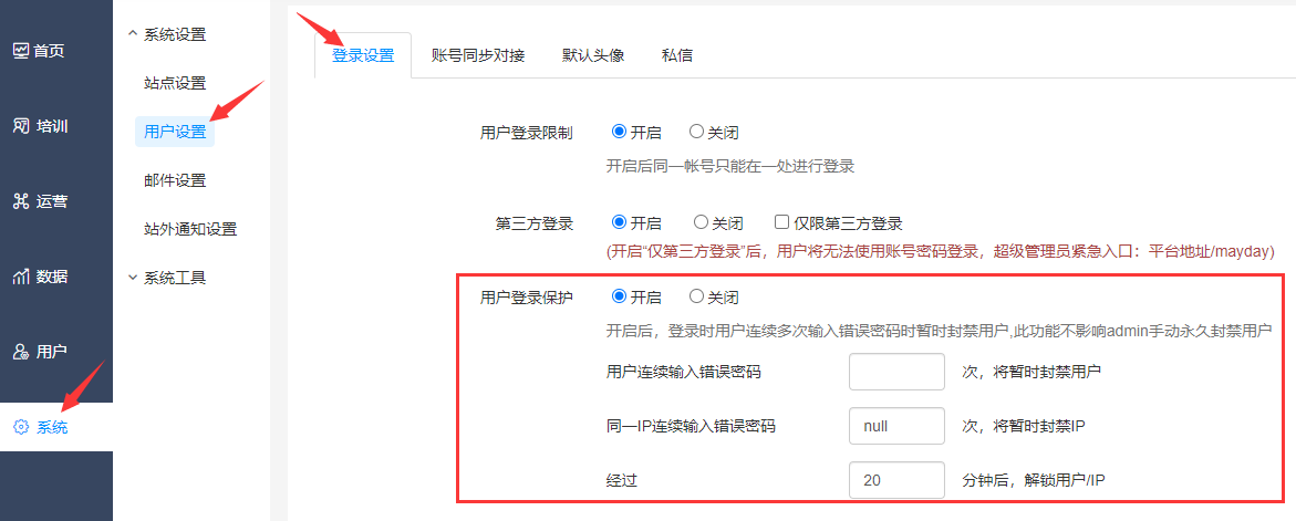 路径:【管理后台】-【系统】-【用户设置】-【登录设置】,开启用户登录保护。