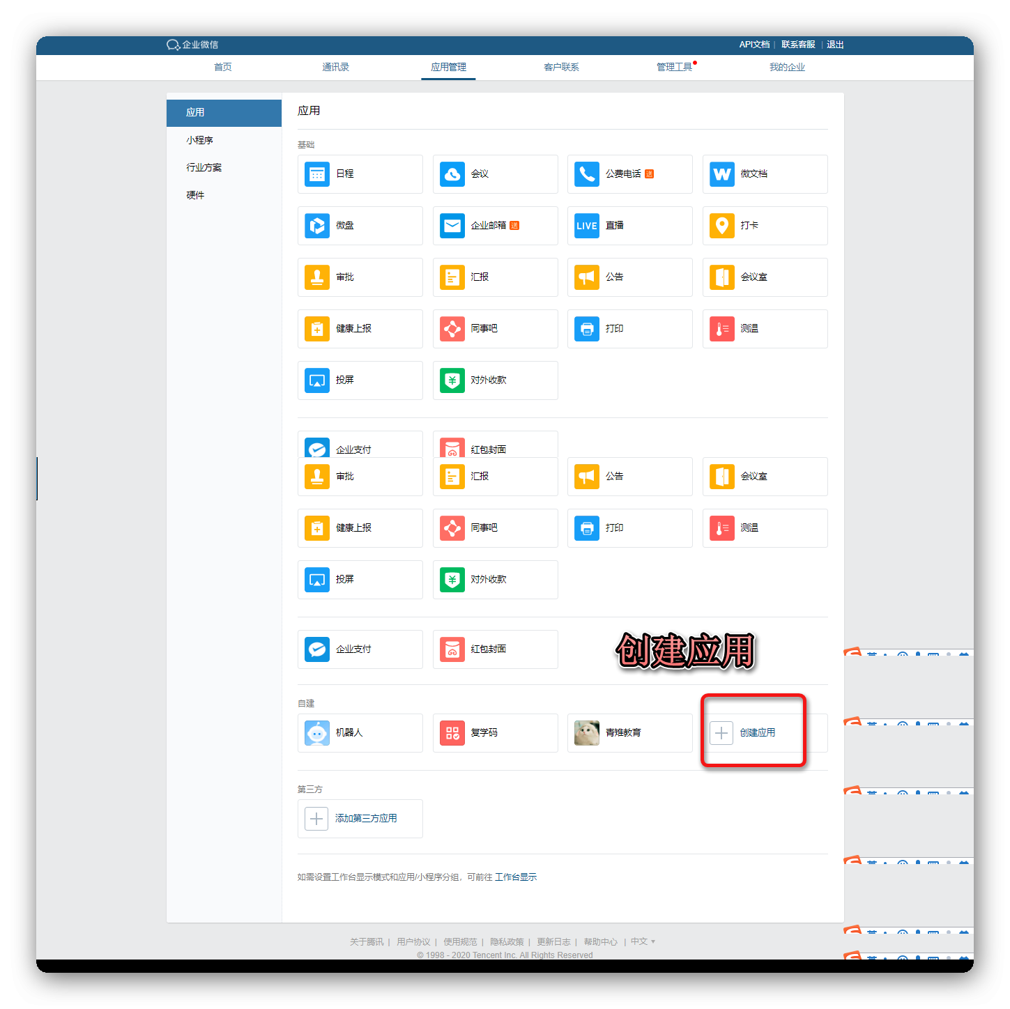 2)进入”企业微信管理后台-应用管理”在”自建”类型下创建应用
