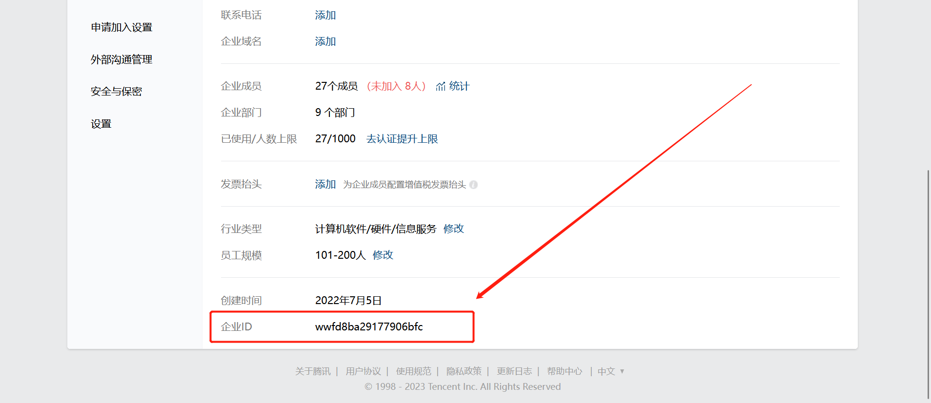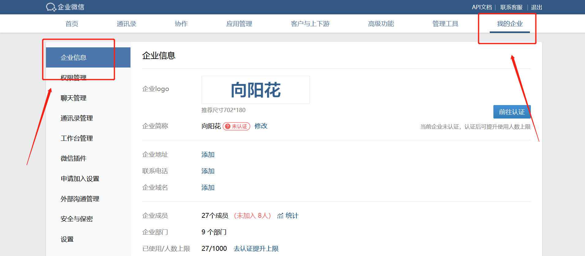 登录企业微信,点击我的企业--查看企业信息,如图所示,CorpId企业微信后台--我的企业--企业id获取;