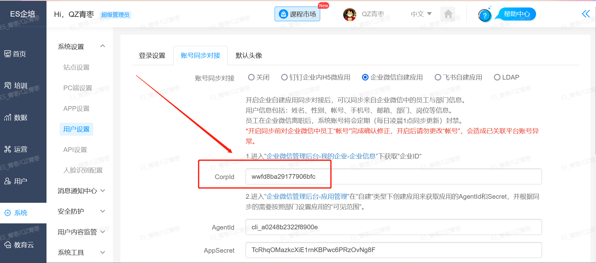 2.打开企培系统的后台配置信息(域名/admin/setting/sync_account),在管理后台--系统--系统设置--用户设置--账号同步对接,将如图所示的信息填写完整。