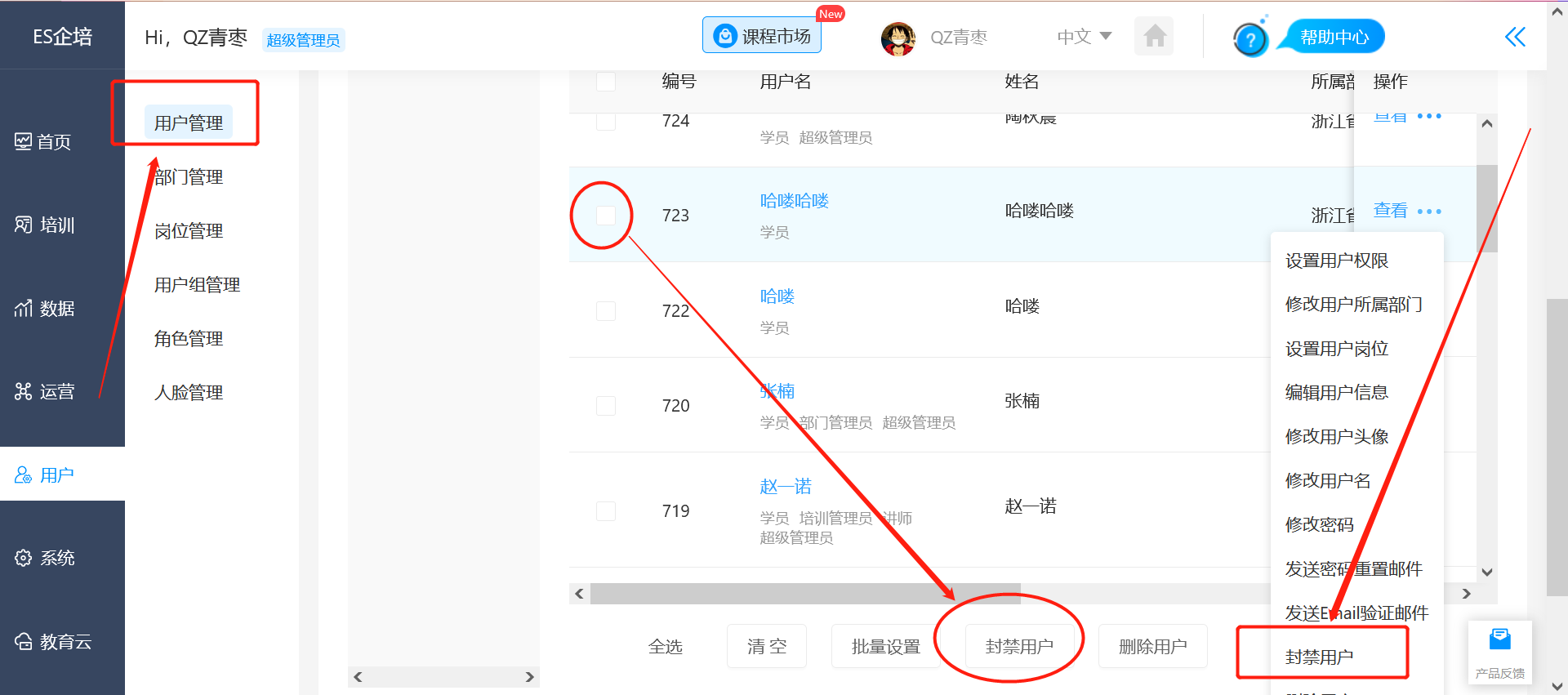 也可以选中用户名点击下面的封禁用户按钮操作,被封禁的用户无法登录进行学习,会提示“该账号已被封禁”。注:封禁用户一般需要超管的权限,也可以自定义角色权限操作。