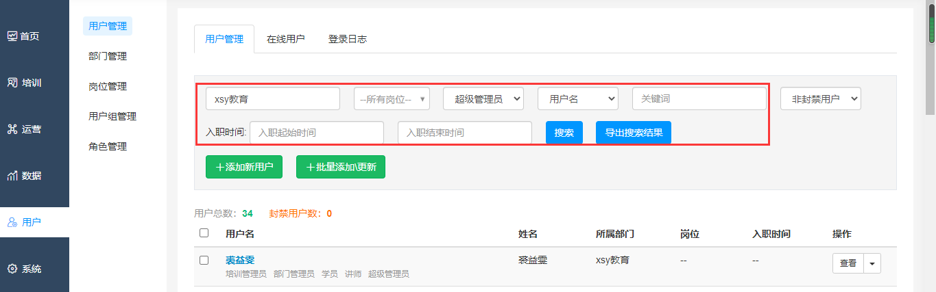 路径:【管理后台】-【用户】-【用户管理】,通过筛选部门组织、岗位、角色、入职时间等信息,批量导出。