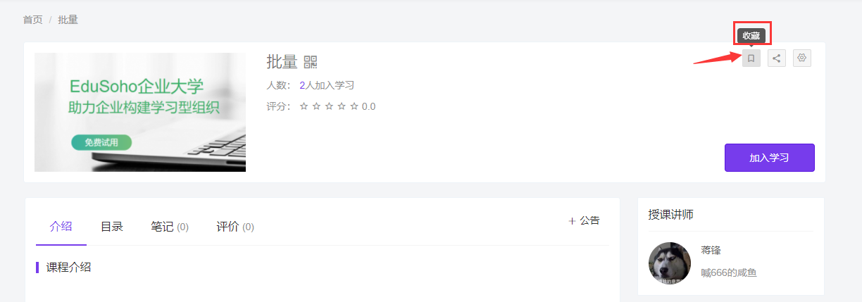 未加入课程时,课程右上角有“收藏”按钮,可以进行收藏