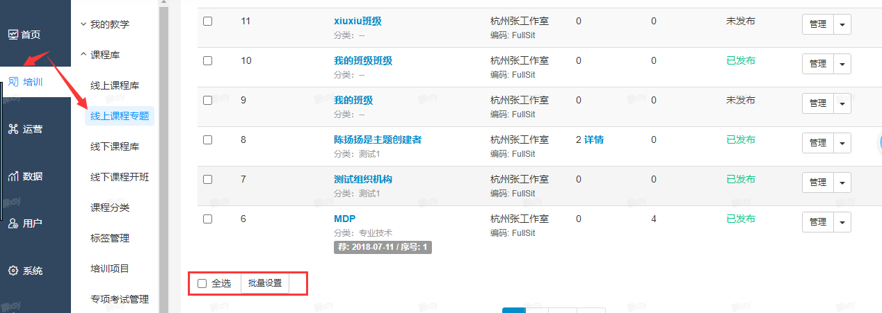ES企培系统版本20.3.12以上,支持批量设置线上课程专题的发布范围。路径:【管理后台】-【培训】-【课程库】-【线上课程库】-【线上课程专题】-【专题管理】,勾选需设置的课程专题,选择【批量设置】-【发布范围】