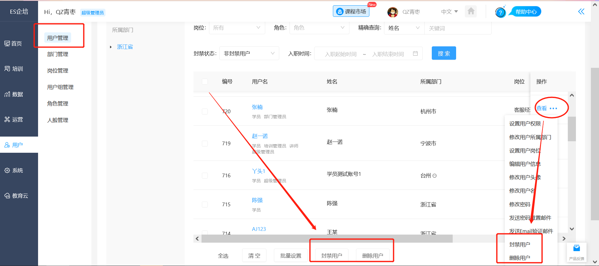 一般情况下建议封禁用户,如果删除用户就彻底删除了,不能恢复。而被封禁的用户无法登录进行学习,会提示“该账号已被封禁”。