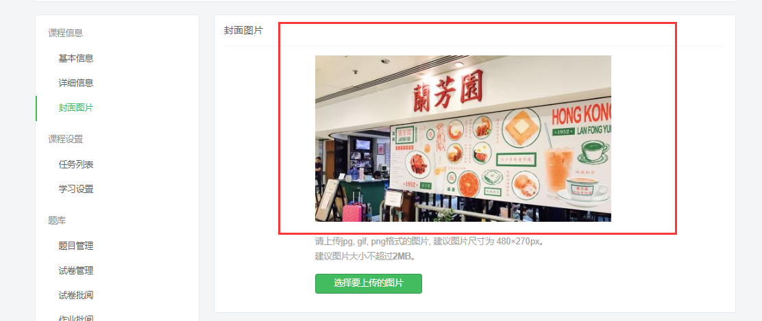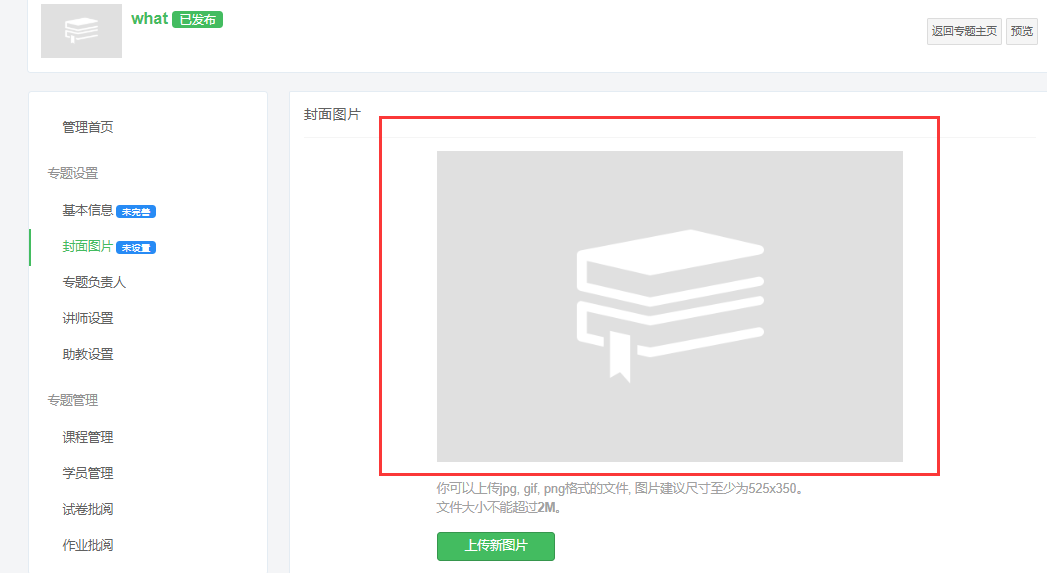 设置路径:【管理后台】-【培训】-【线上课程】-【线上课程专题】,打开对应专题,管理页面封面图片