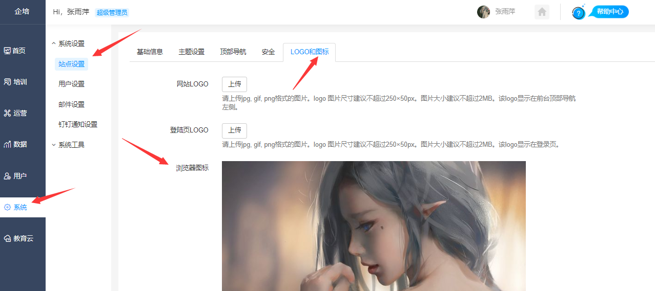 设置路径:【管理后台】-【系统】-【站点设置】-【logo和图标】,浏览器图标