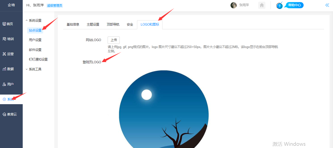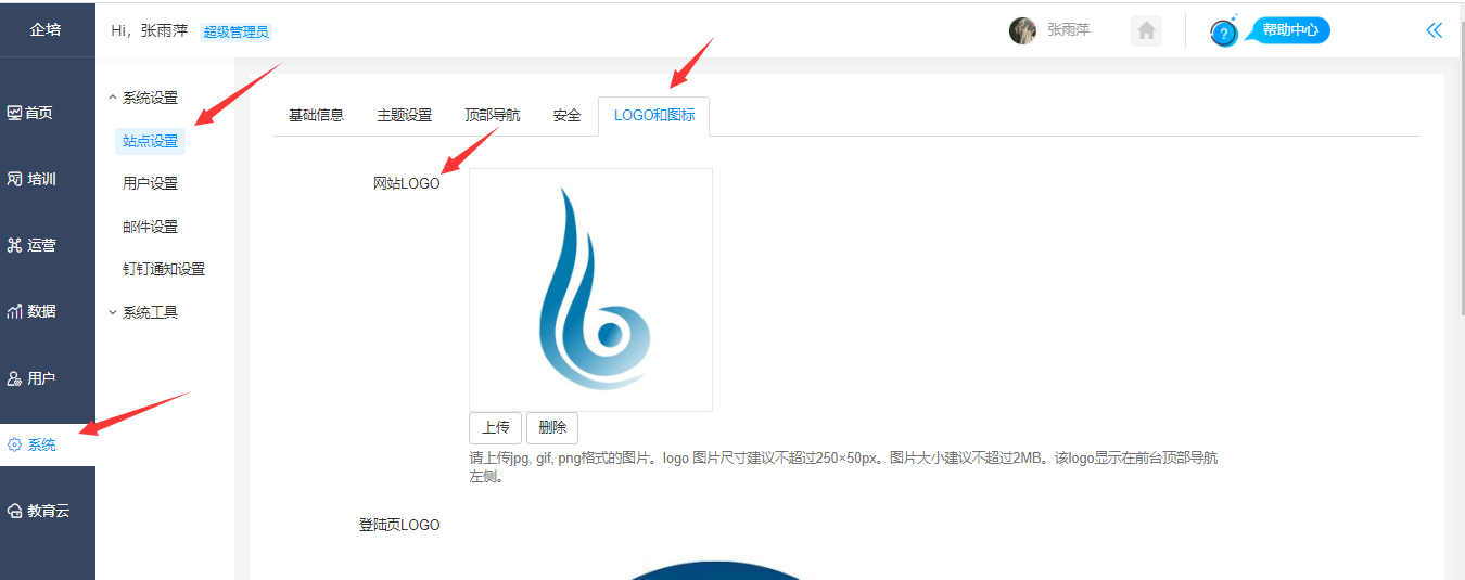 设置路径:【管理后台】-【系统】-【站点设置】-【logo和图标】,登陆页logo 请上传jpg, gif, png格式的图片。