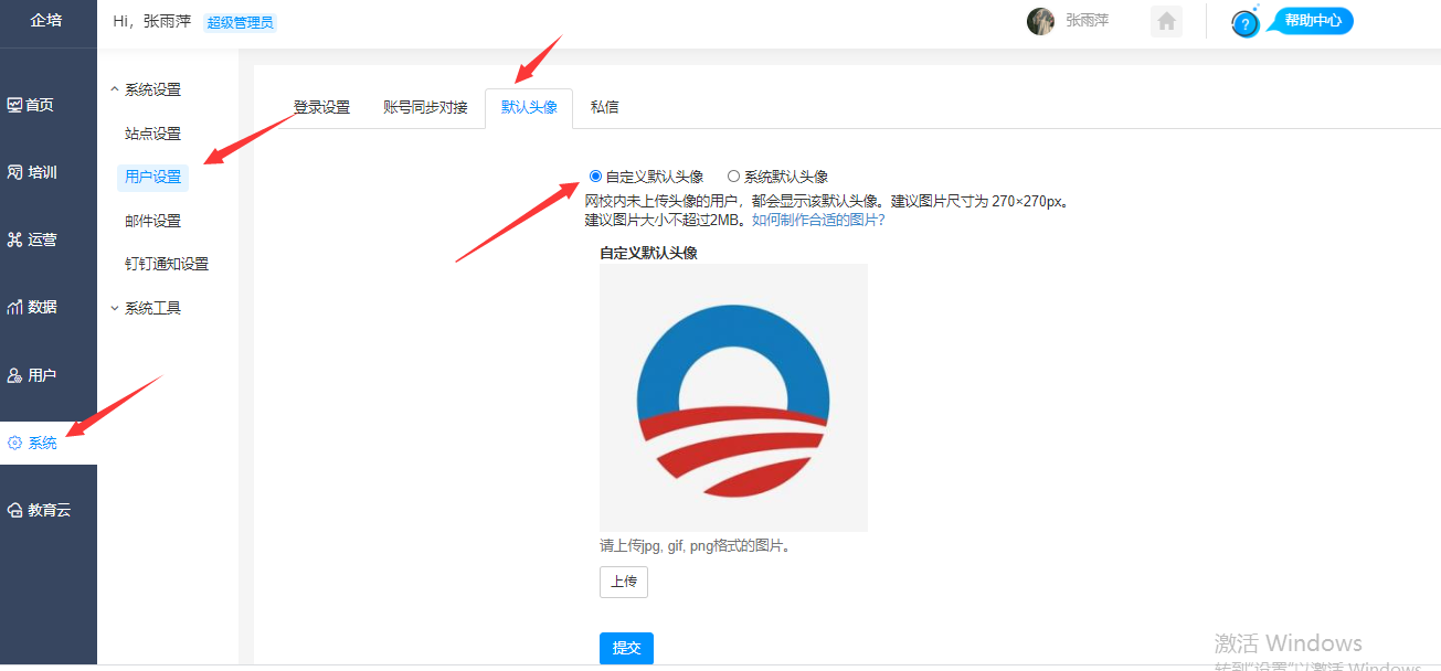 设置路径:【管理后台】-【系统设置】-【用户设置】-【默认头像】,网校内未上传头像的用户,都会显示该默认头像。