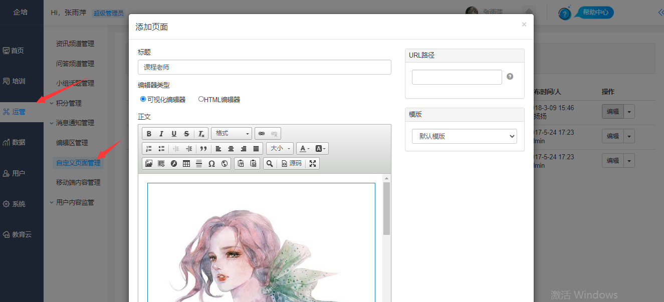 路径:【管理后台】-【运营】-【自定义页面管理】