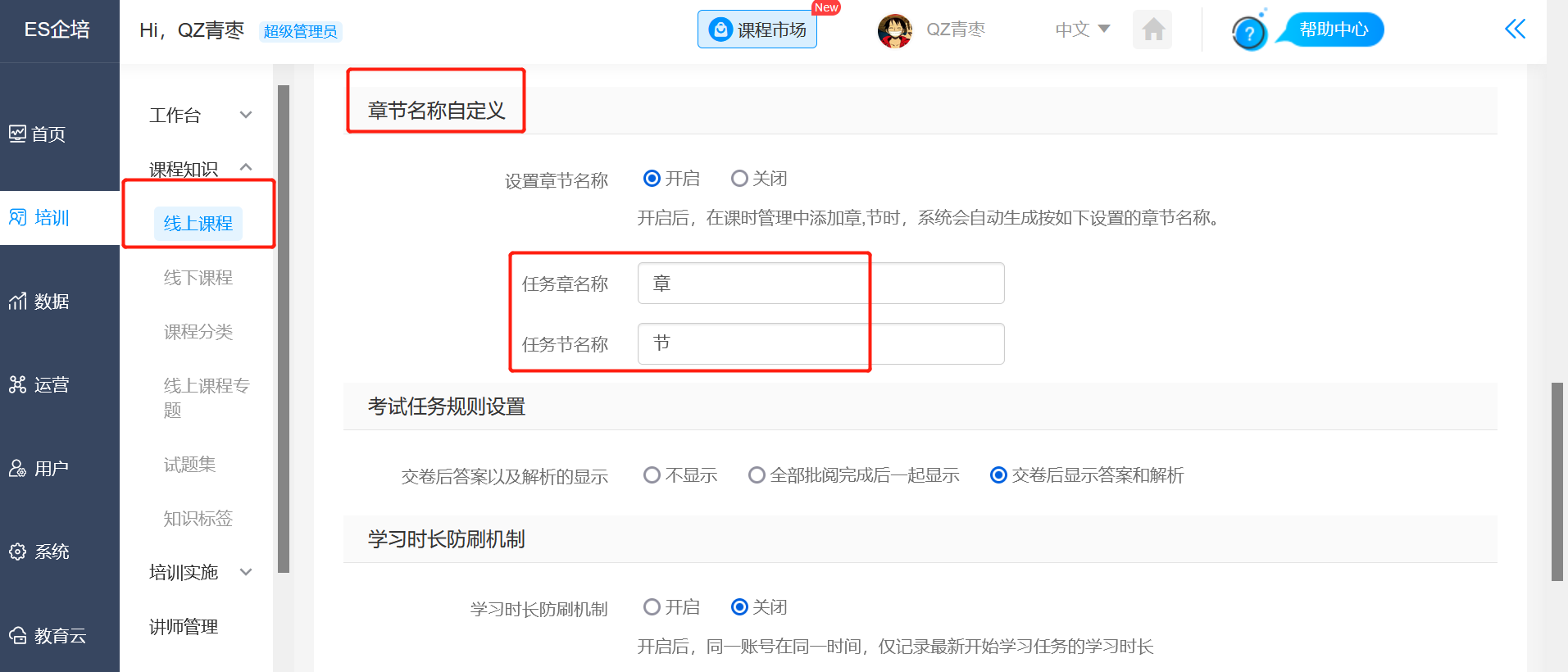 路径:【管理后台】-【培训】-【课程知识】-【线上课程】-【课程设置】-【章节名称自定义】