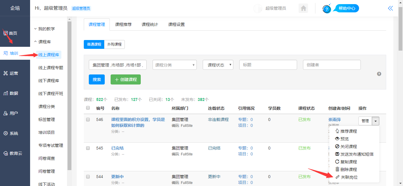 1.超级管理员/培训管理员可以在【后台管理】-【培训】-【课程库】-【线上课程库】-【课程管理】这里关联岗位课程。